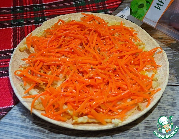 Выложить горячий картофель на блюдо для подачи, на него сразу разложить 2/3 моркови.