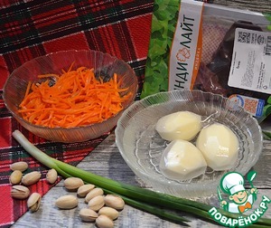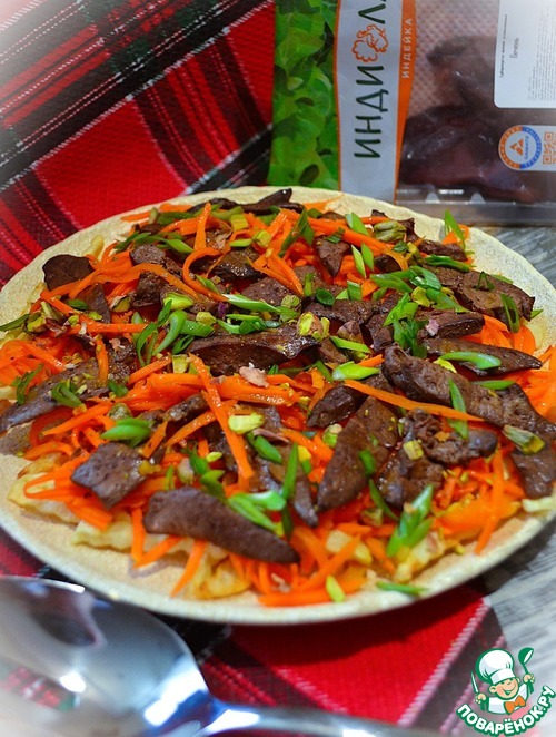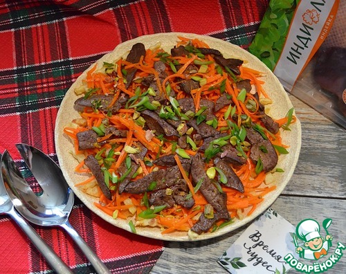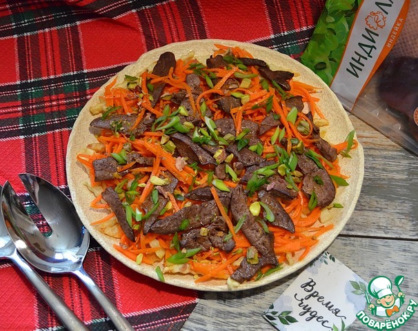 На печень остатки моркови, рубленые фисташки и зелень лука.