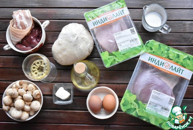 Для начала подготовим продукты. В блюде используется печень, красное и белое мясо. Идеально будет использовать в качестве белого мяса филе грудки индейки "Индилайт" и более темное мясо филе бедра и печень данной ТМ.