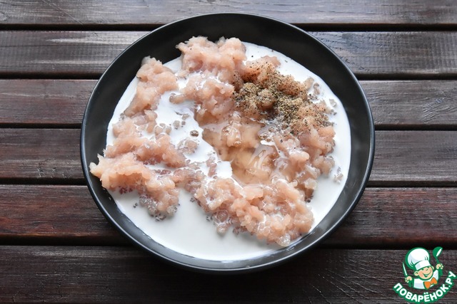 Перекрутите филе грудки индейки на мясорубке с мелкой решеткой.