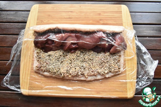Сверху на мясо разложите начинку из грибов. На середину вдоль разложите крупные целые кусочки печени.