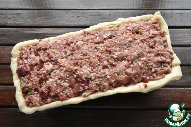 На дно формы выложите половину начинки 2 из красного мяса, сделав по центру углубление для рулета.