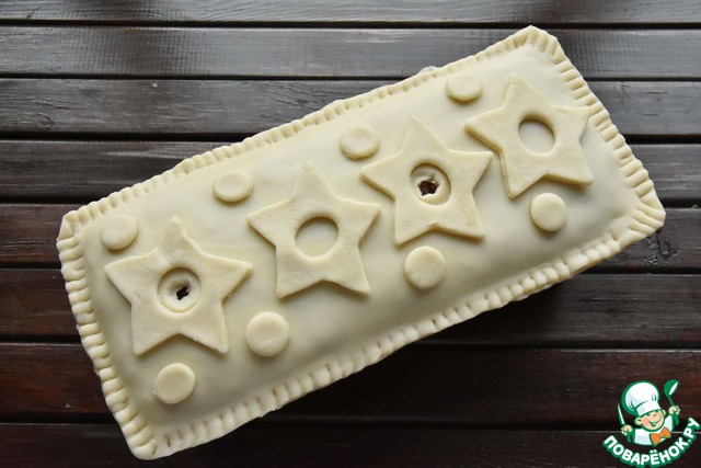 Оставшееся тесто раскатайте в прямоугольник и покройте пирог сверху, скрепив края по всему периметру формы. Остатками теста украсьте пирог. Сделайте несколько небольших отверстий для выхода пара.