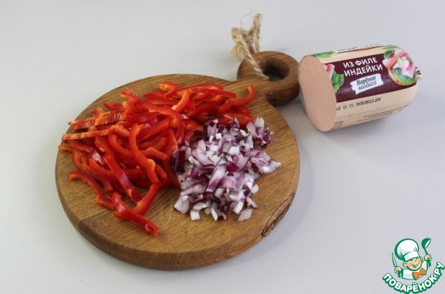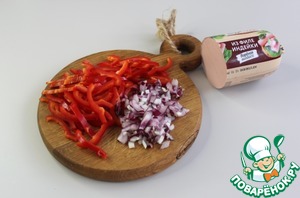Красный перец очистите от семян, нарежьте соломкой, а лук маленькими кубиками.