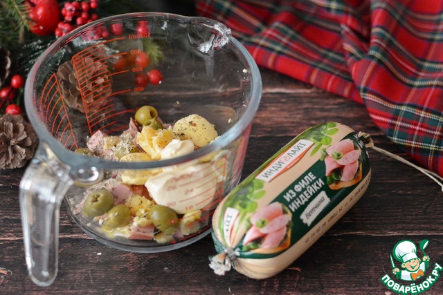 В рабочую миску положите нарезанную ветчину, желтки, добавьте оливки, майонез и приправьте специями на свой вус.