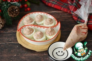 Переложите начинку в кондитерский мешок, срежьте кончик и наполните половинки яичных белков начинкой из ветчины.