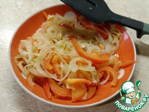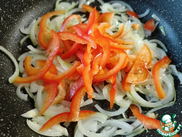 • Обжарить нарезанный лук до мягкости. Добавить нарезанный соломкой сладкий перец. Обжаривать еще минуты 2-3 минуты.