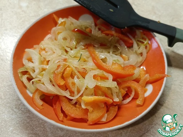 Обжарить нарезанный лук до мягкости. Добавить нарезанный соломкой сладкий перец. Обжаривать еще минуты 2-3 минуты.