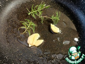 • На сковороде разогреть масло. Положить чеснок и розмарин и дождаться, когда пойдёт аромат.