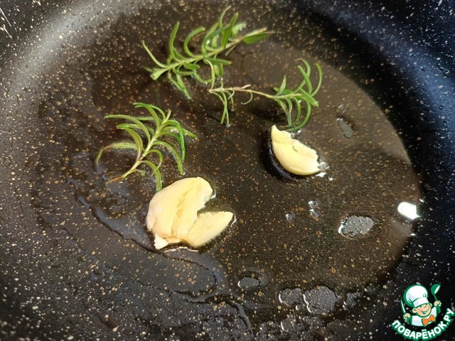 На сковороде разогреть масло. Положить чеснок и розмарин и дождаться, когда пойдёт аромат.