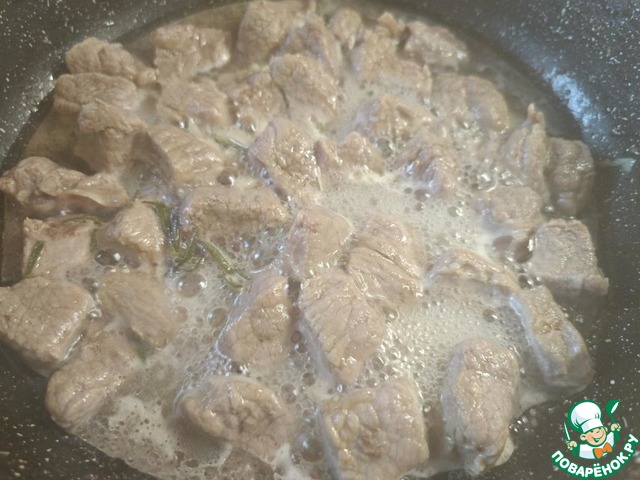 В сковороду с индейкой влить вино и выпарить алкоголь минут 5.