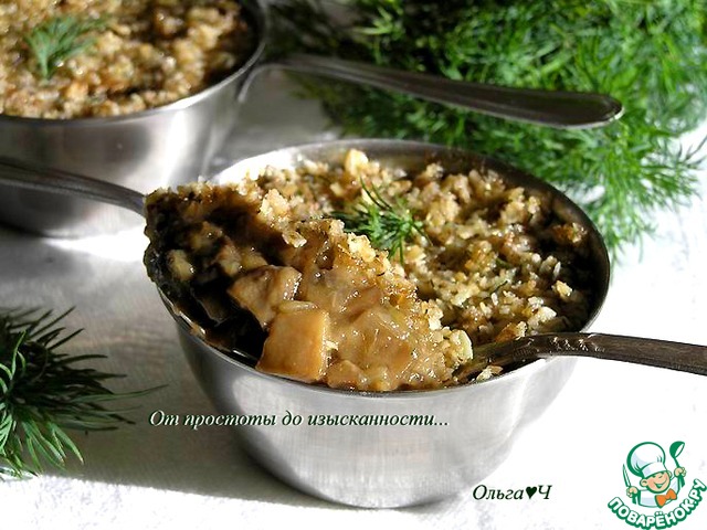 Нежный грибной крамбл под хрустящей корочкой из овсяных хлопьев. Очень вкусная закуска, похожая на жюльен, только в постном варианте. Попробуйте!