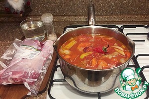 В сотейник с мясом добавить овощной соус, влить воду + перец чили (по желанию). Довести до кипения, убавить огонь. Накрыть крышкой и тушить один час на малом огне