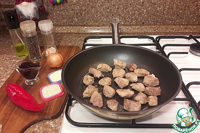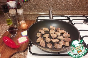 Мяско обжарить на сковороде с маслом до полной готовности. Приблизительно 15 минут