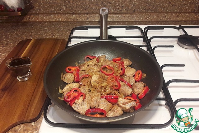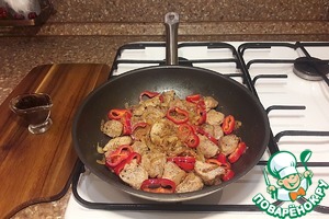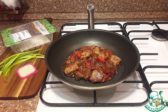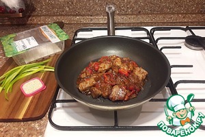 Добавить соус Терияки. Прогреваем еще одну минуту, помешиваем.