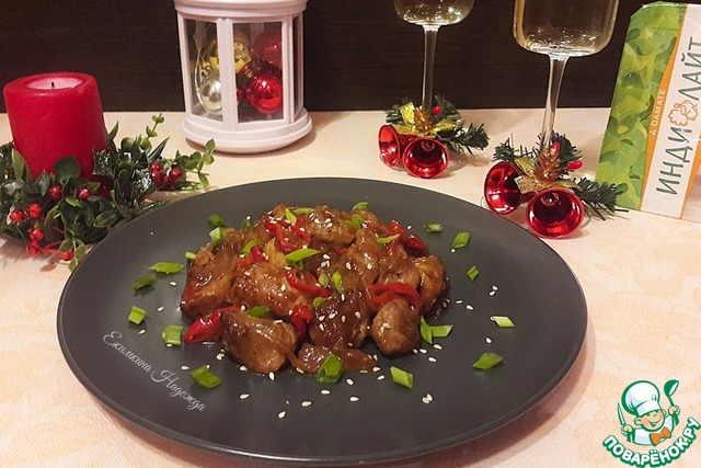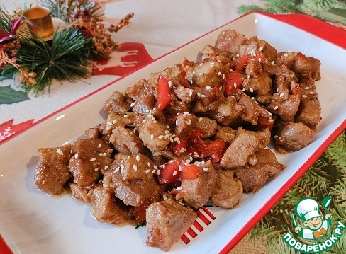 Перекладываем мяско в посуду для подачи. Посыпаем порезанным зеленом луком и кунжутом.