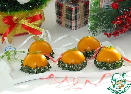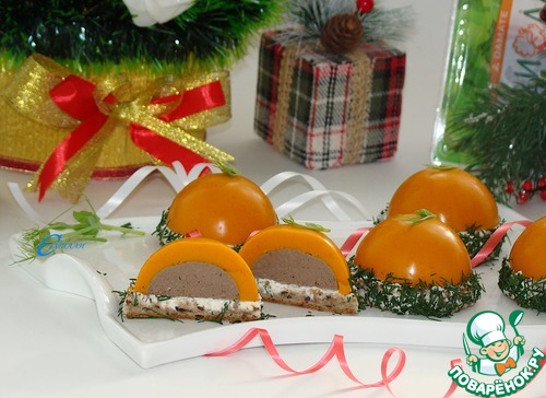 Затем в серединки поместите застывшие заготовки из паштета и залейте остатками облепихового желе.