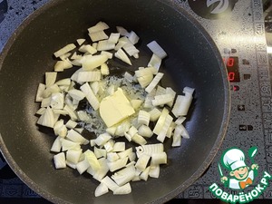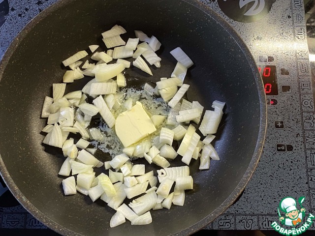 Луковицу нашинкуйте не сильно мелко и обжарьте на сливочном масле до румяности. -