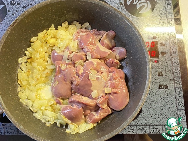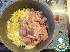 К луку добавьте индюшиную печень и чеснок, перемешайте и потушите в течение 7-10 минут. Влейте коньяк и еще потушите в течение 5 минут.