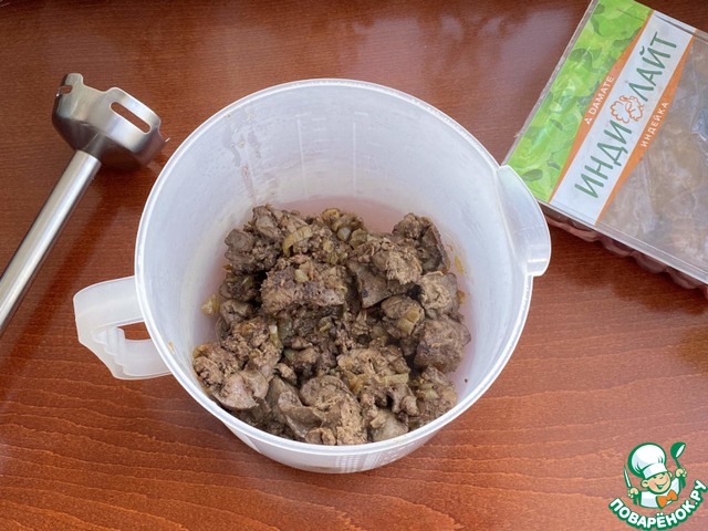 Готовую печень переложите в глубокую миску и пробейте до однородности, погружным блендером.