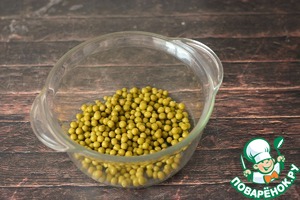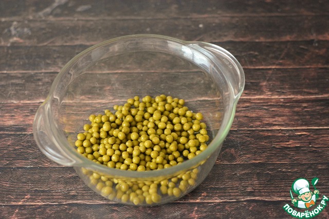 На дно миски выложите зелёный горошек, предварительно слив с него жидкость.