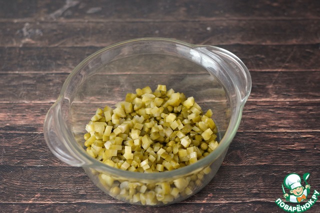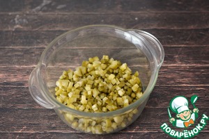 Маринованные огурцы нарежьте кубиком и выложите поверх горошка.