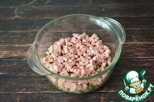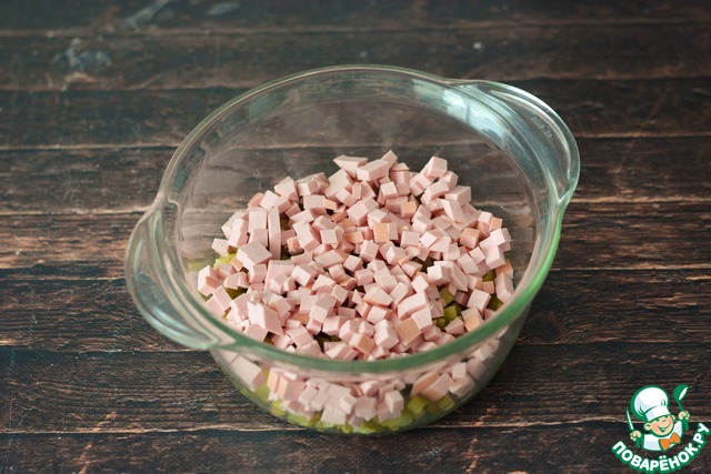 Следующим слоем выкладываем нарезанную кубиком варёную колбасу.
