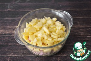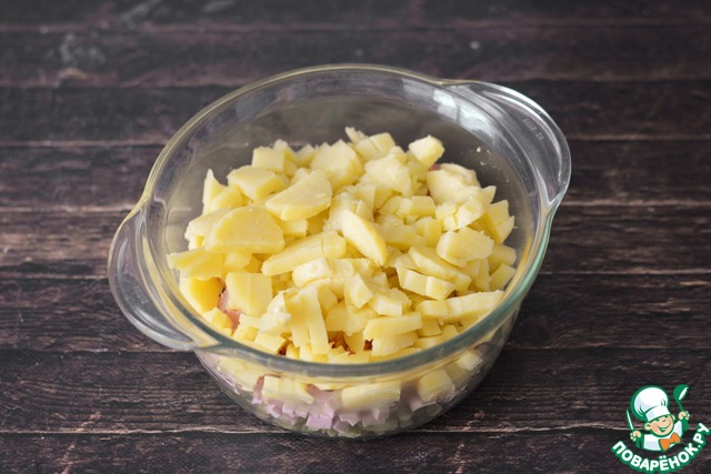 На колбасу выложите нарезанный кубиком отваренный и полностью остуженный картофель.