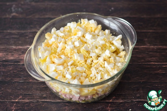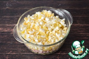 На картофель выкладываем слой нарезанных кубиком варёных яиц.