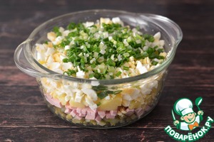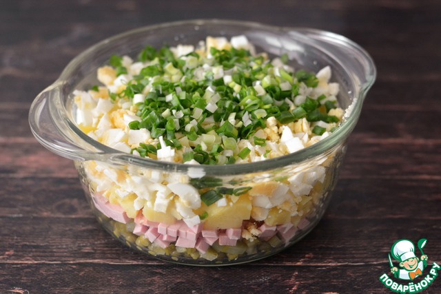Ну и самый последний слой - нарезанный зелёный лук. Это, кстати, ещё один ингредиент, который отличает "Зимний" от "Оливье".