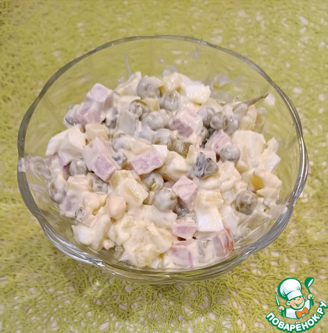 Размер кубиков всех ингредиентов должен быть соизмерим с размером зелёного горошка - так ваш салат будет выглядеть намного презентабельнее. -