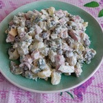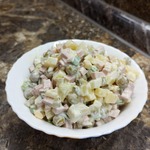 В моём детстве не готовили салат "Оливье", а готовили салат, который назывался "Зимний". Название "Оливье" у нас появилось уже, наверное, в середине 90-х годов. А вот "Зимний" делали на все праздники, и в обязательном порядке на Новый год. И если "Оливье" может быть с любым видом мяса или птицы, то "Зимний" готовится исключительно с колбасой. Также, в нём нет моркови и заправляется он всегда только сметаной. Милости прошу на дегустацию нашего семейного "Зимнего" салата.