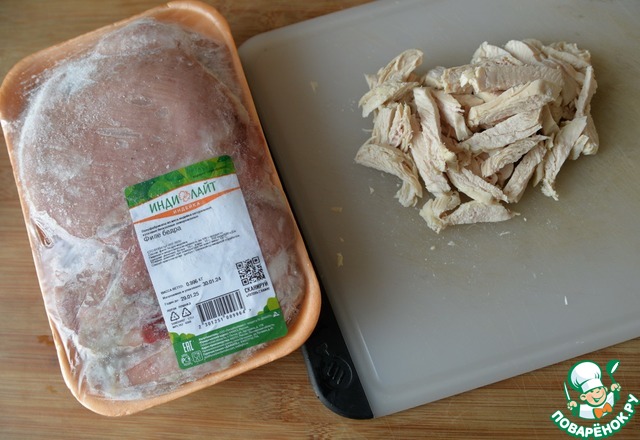 Для приготовления салата берём филе индейки. У меня - филе бедра индейки Индилайт. Заливаем необходимое количество филе водой, доводим до кипения, снимаем пену и варим в подсоленной воде до готовности около 40 минут на слабом огне. Готовому филе даём остыть, режем полосками или кубиками.