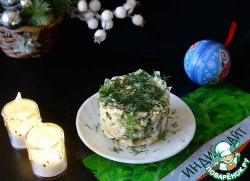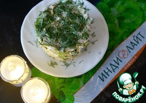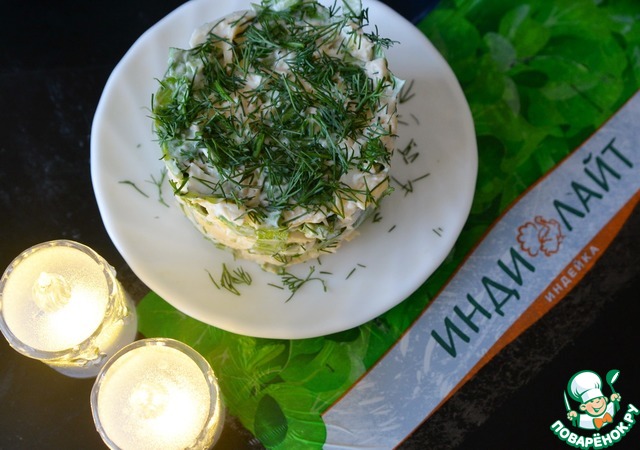 Перемешиваем салат, подаём в салатнике или порционно. При подаче посыпаем рубленным укропом.