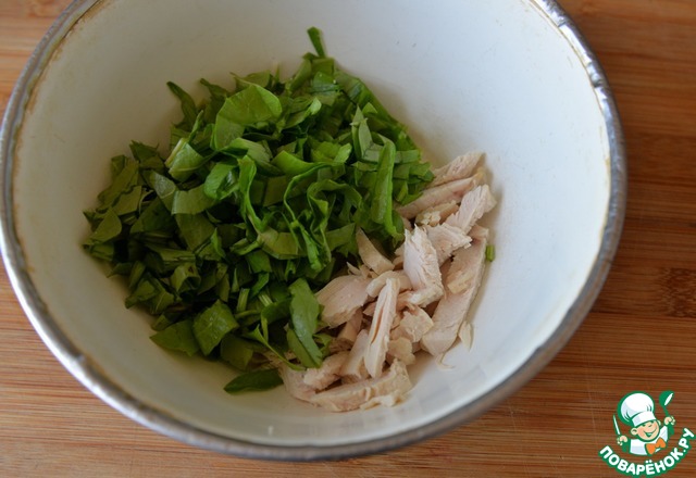 Шпинат тщательно моем, обсушиваем полотенцем, режем полосками, кладём к индейке.