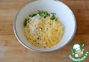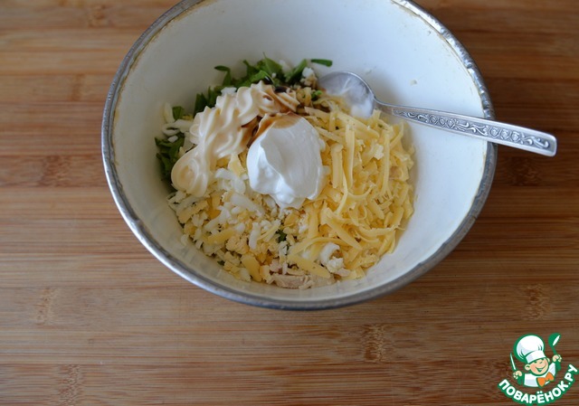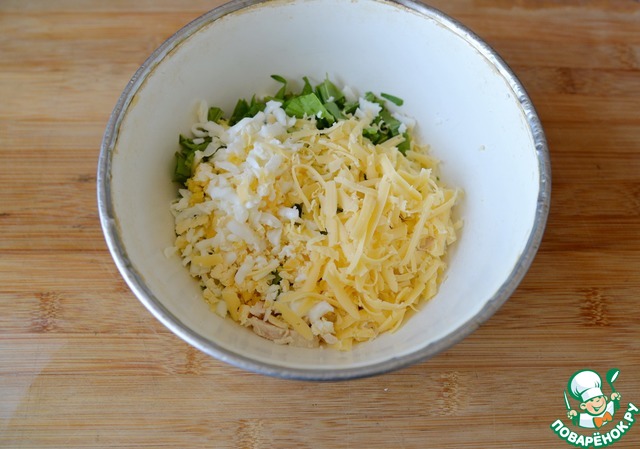 Добавляем в салат тёртые на тёрке вареные яйца и твёрдый сыр.