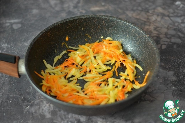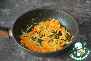 Разогрейте в сковороде масло. Нарежьте соломкой лук и морковь и обжарьте их на среднем огне до золотистого цвета.
