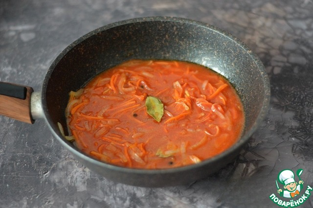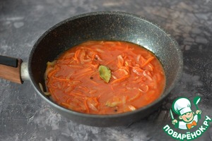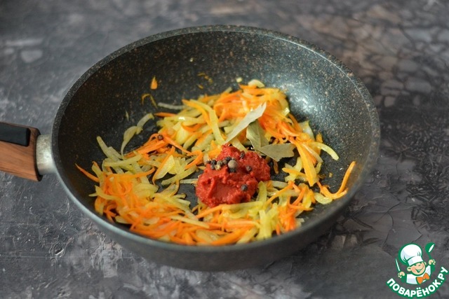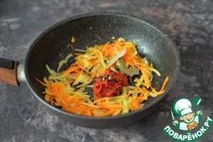К луку и моркови добавьте томатную пасту, лавровый лист и перец горошком.