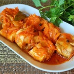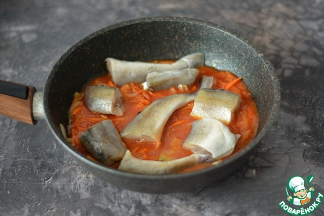 Навагу нарежьте на порционные куски и положите в томатный маринад.