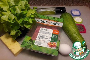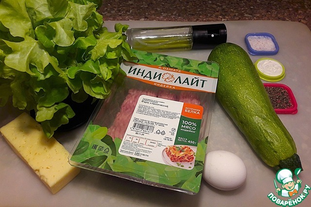 Для приготовления бургера понадобится - фарш индейки, кабачок, соль + перец, яйцо, твердый сыр, разрыхлитель теста