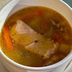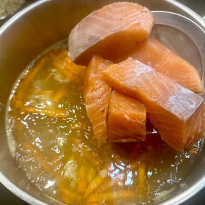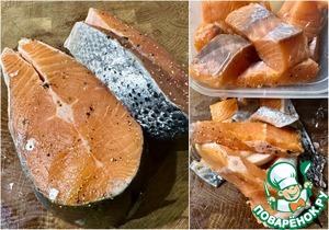 А вот пара стейков лососёвых залежались с незапамятных времен в морозилке. Шкура и кости с них тоже в бульон отправились. Остальное в суп, как «просто рыба» пойдёт.
