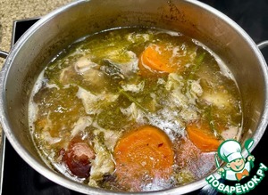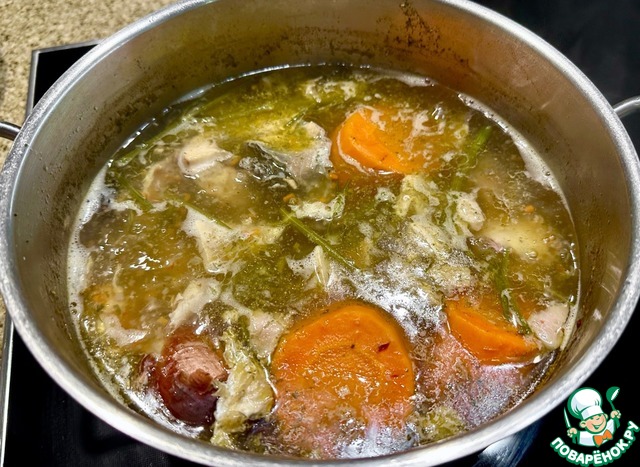 Бульон, как обычно. Рыбы образовалось примерно полтора килограмма. Значит воды – два с половиной литра. Сначала на сильный нагрев. Закипело. Пока пена выделялась держал на сильном нагреве, убирая пену. Потом нагрев на минимум, что едва-едва, редко взбулькивало. Морковку, луковицу, зеленый букет, сухие коренья, перцы горошком. Никакой соли.