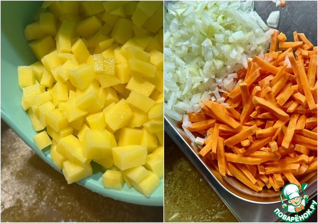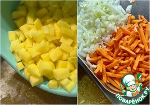 Три крупных картофелины нарезал мелко, кубиками. Морковку в этот раз брусочками, а лук кубиками.