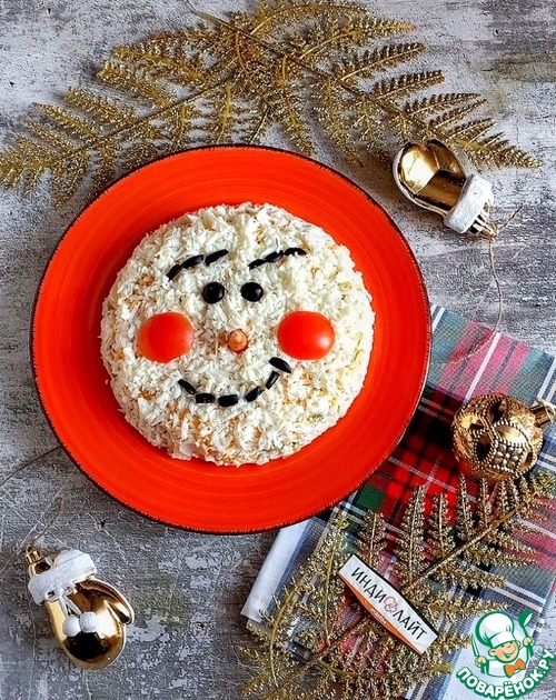 Наверное, по мотивам "Снежка". Потому, что для этого салата берётся куриная грудка, запечённая в духовке. Я же возьму филе индейки и отварю его со специями и овощами. Новогодний праздничный салат. На новогоднем столе будет украшением в виде головы "добродушного" снеговика.