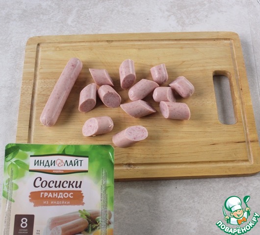 Сосиски нарежьте наискосок на кусочки длиной 3 см.