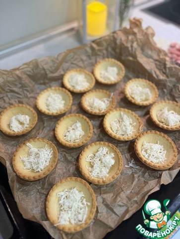 На противень, застеленный пергаментом, разместить тарталетки. На дно тарталеток выложить натертый на мелкой терке сырочек