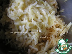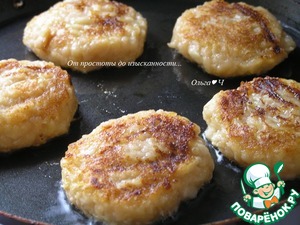 Из полученной массы чуть влажными руками сформируйте 6-8 оладий, выложите на разогретую антипригарную сковороду с растительным маслом.