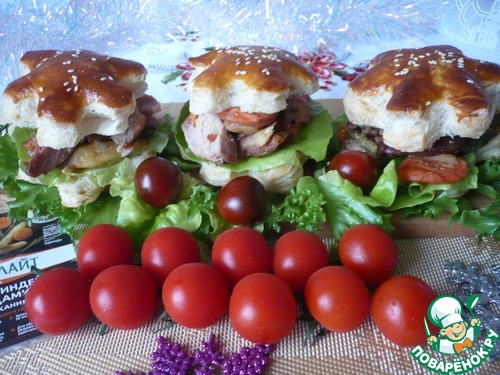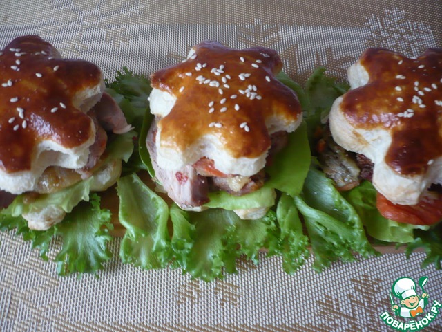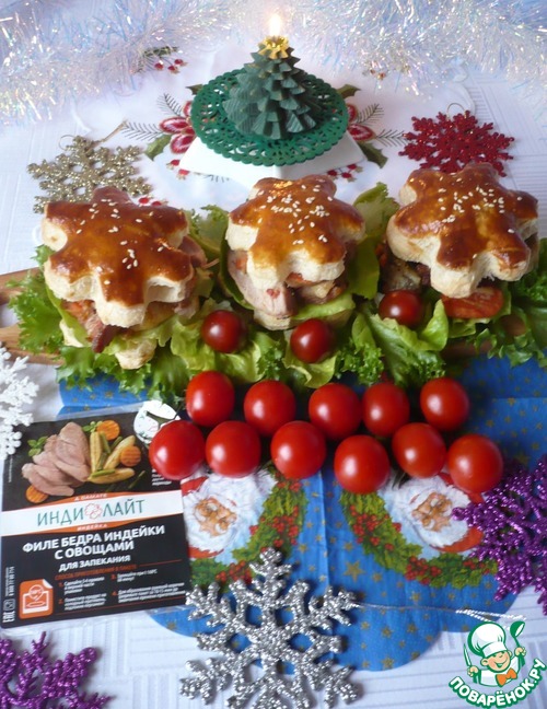 Готовые слойки "снежинки" разрезать пополам, на нижнею часть положить лист салата, а сверху запеченное филе бедра индейки с овощами.