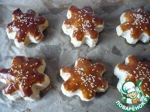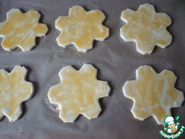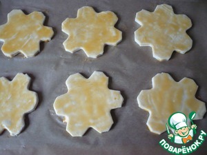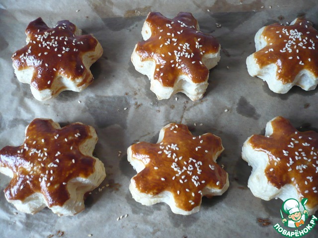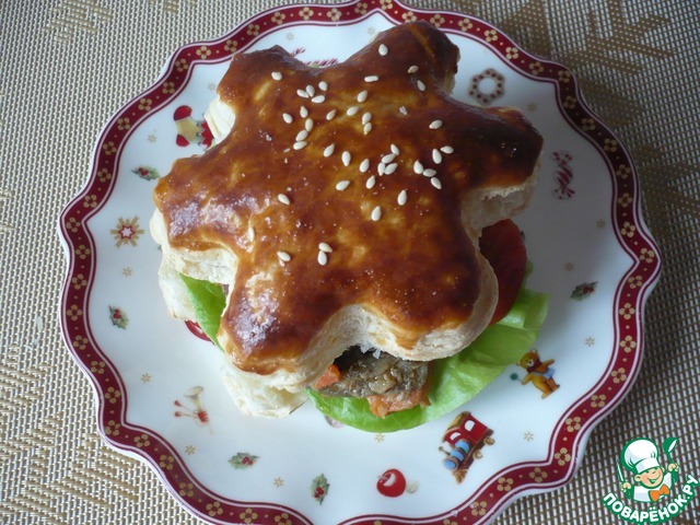 Я подавала к столу блюдо порционно. Приготовив из слоеного бездрожжевого теста слоечки в форме "снежинок"для подачи. "Снежинки"- вырезать с помощью вырубки, выложить на противень застеленный пергаментной бумагой и смазать яйцом, сверху можно посыпать белым кунжутом.