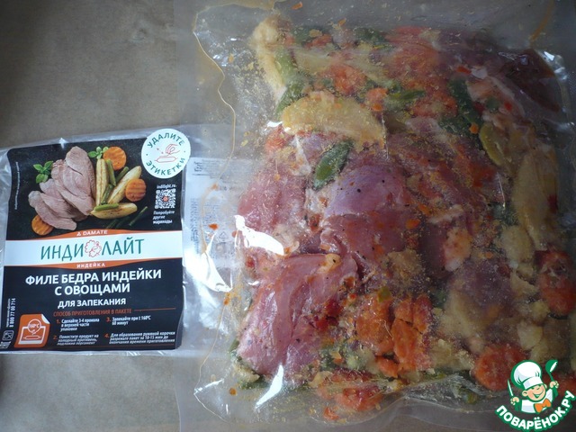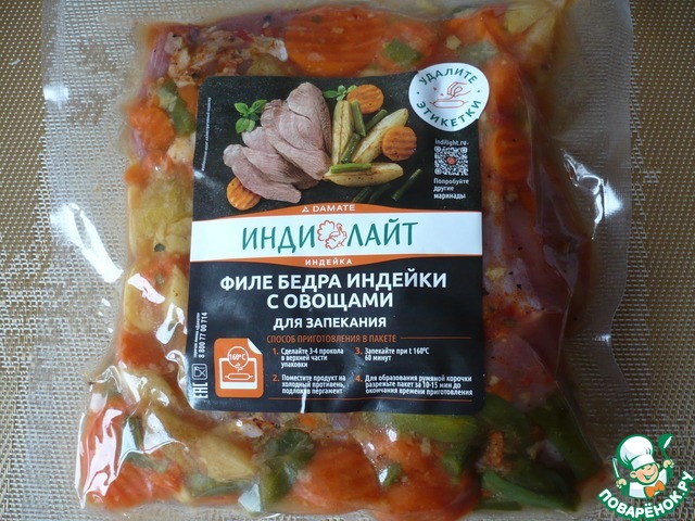 Затем действуем по инструкции. Запекать блюдо будем в вакуумной упаковке (в которой находится филе бедра индейки с овощами).
